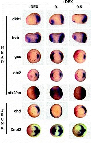 Fig. 3. Organiser gene expression in GR-Sia injected embryos induced at various stages. Embryos were injected ventrally with 50 pg/bl GR-Sia mRNA and 400 pg/bl LacZ RNA at the four-cell stage and DEX (10 μM) was either omitted (âDEX), or added 15 min before stage 9 (9â), or at stage 9.5. β-Galactosidase activity was revealed in red, and embryos were then processed for in situ hybridisation. For dkk1 and frzb, embryos were manually bisected prior to hybridisation. In all panels, the natural dorsal side is right. For otx2, the animal view (otx2/an) reveals the extent of the anterior neural plate. All dorsal genes examined, belonging to head and trunk classes, were robustly induced when DEX was added at stage 9â, while treatment at stage 9.5 provoked no or very weak induction.