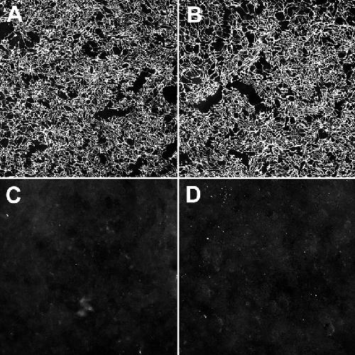 Fig. 1. Anti-FN mAbs inhibit matrix assembly in vivo. Embryos were injected with a mouse mAb and FN detected with an anti-FN rabbit polyclonal. (A) BCR of stage 11.5 sham-injected embryo showing normal FN fibril formation. (B) BCR of sibling embryo injected with the non-blocking anti-FN mAb 4H2. (C) Injection of mAb 1F7 directed against the synergy site of FN inhibits BCR matrix assembly at stage 11.5. (D) mAb 4B12 directed against the RGD-containing central cell-binding domain of FN. |