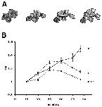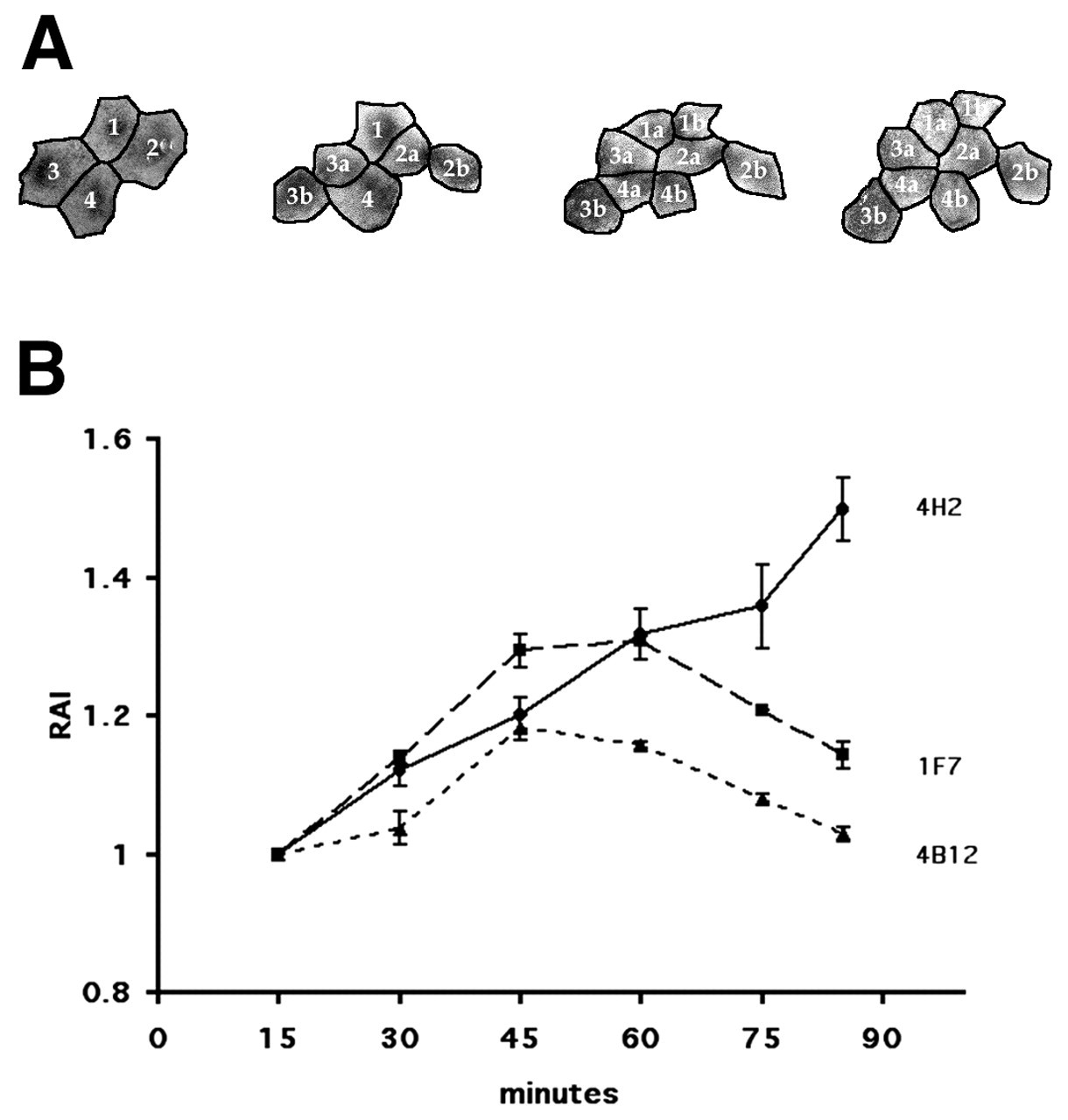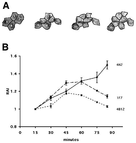Fig. 5. The relative area index (RAI) was estimated from digital images captured from DMZ during early and mid-gastrulation. This measurement compares the relative area occupied by cells and all clonal derivatives during gastrulation (Keller, 1978). (A) Samples of DMZ RAI tracings for a 4H2-injected embryo are shown. Numbers indicate original cells in group, while letters indicate daughter cells. (B) The RAI in mAb 4H2 embryos increases throughout gastrulation (unbroken line). In mAb 1F7- (dashed line) and mAb 4B12- (dotted line) injected embryos there is an initial increase in the RAI until stage 10.5, followed by a decrease in later gastrulation. |