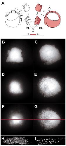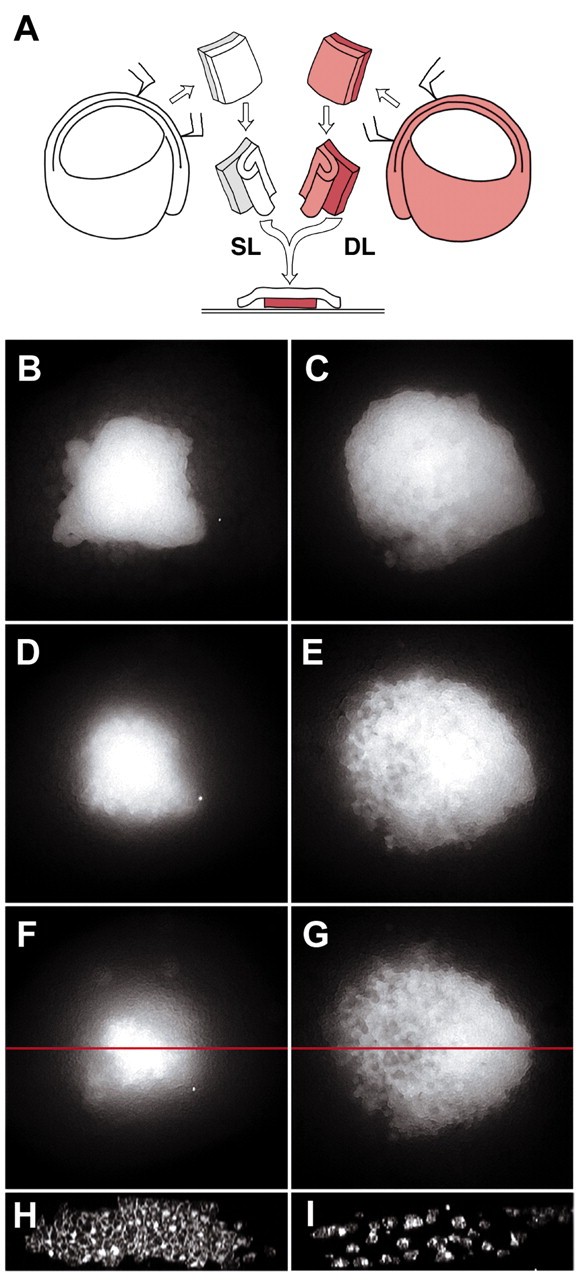 Fig. 8. Intercalative behaviors in the BCR. We developed an in vitro deep layer explant to examine intercalative behaviors in a reconstituted BCR. The assay took place over 120 minutes. (A) DMZ zone tissue was cut from dextran labeled (red) embryos and layers of deep cells lining the blastocoel (DL) were shaved from the explant and placed on substrate (FN or BSA) coated coverslip. A similar DMZ fragment was cut from unlabeled embryo and the superficial layer and a few layers of deep cells (SL) were used to overlay the labeled tissue. Intercalative behavior was monitored by image capture of the deep layer of the explant. On BSA (B,D,F,H), the labeled patch incorporated into the BCR. Vertical confocal sectioning (red line in F) showed that the tissue remained coherent (H). When explants are plated on FN, the labeled patch was broken up by intercalating cells (C,E,G,I). Vertical sections of the explant (red line in G) showed that unlabeled cells intercalated between labeled cells distant from the substrate (I). |