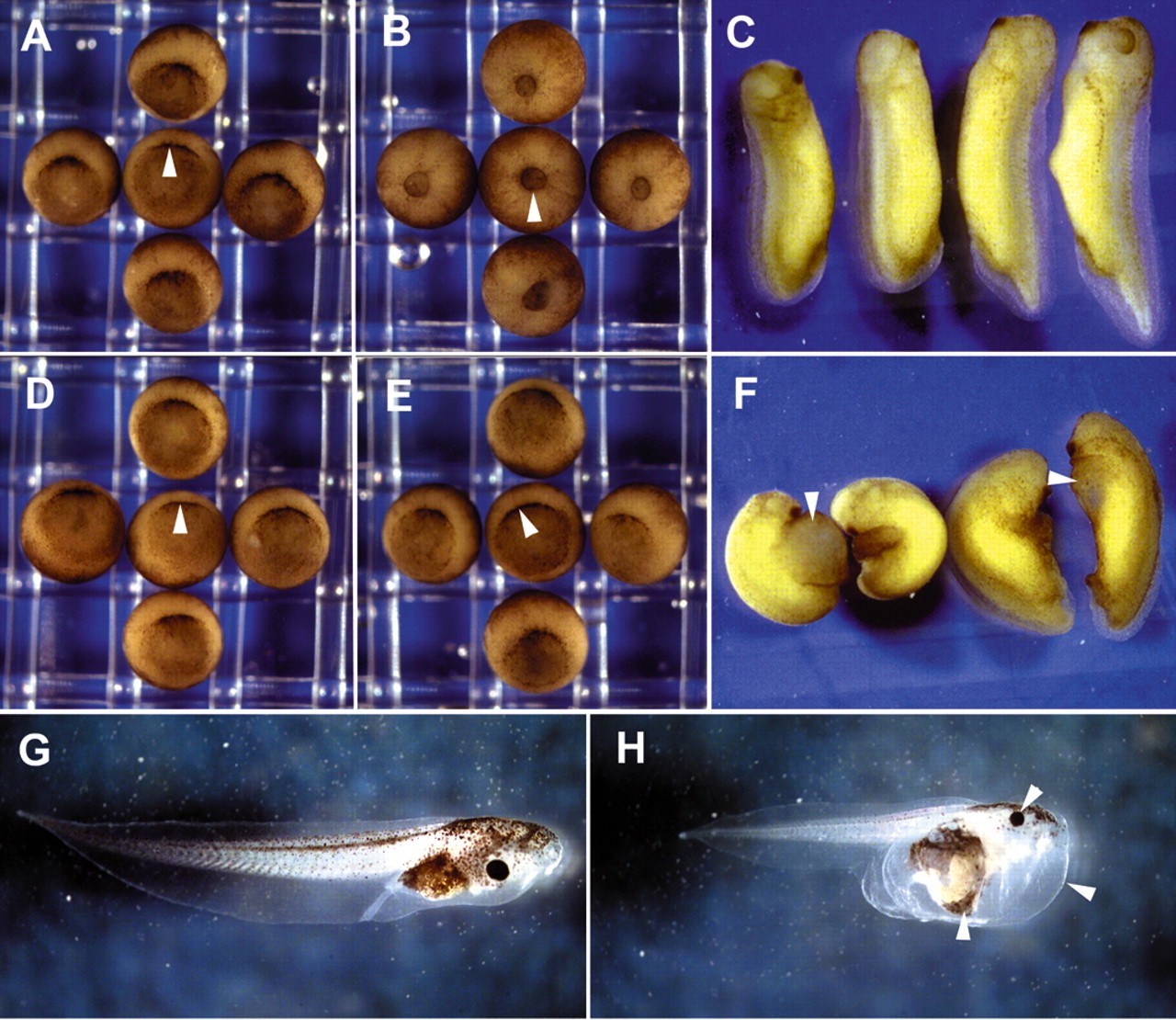 Fig. 2. Intra-blastocoelar injection of anti-FN mAbs disrupts gastrulation. (A-C,G) Embryos injected at stage 9.5 with mAb 4H2 show normal development at stage 10.5, as indicated by dorsal lip formation (A, arrowhead). (B) At stage 11.5 the blastopore is almost closed (arrowhead) and embryos go onto develop into tadpoles (C,G). mAb 1F7-injected embryos (D-F,H) develop a normal blastopore at stage 10.5 (D, arrowhead). (E) By stage 11.5, there is a significant delay in blastopore closure and little movement of the blastopore lip is apparent (arrowhead). (F) mAb 1F7-injected embryos are truncated along the AP axis and bent ventrally. The blastocoel is retained and displaced ventrally (arrowhead). (H) Blastulae injected with mAb 1F7 develop into tadpoles that have small eyes, display head edema, and lack gut (arrowheads), heart, blood vessels and blood. |