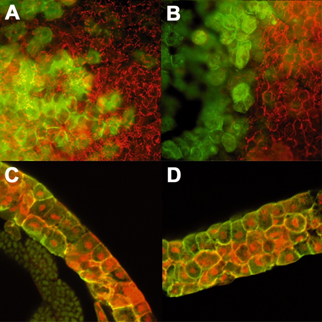 Fig. 9. Intercalative behaviors require β1-containing integrins. Two-cell embryos were injected in one blastomere with either 1 ng HA RNA (control) or the same amount of dominant-negative HAβ1 chimera RNA. (A,C) Expression of HA has no effect upon FN matrix assembly (A; HA in green, FN fibrils in red, overlap in yellow) or on BCR thickness (C; HA shown in green, dextran for contrast is red). (B,D) Expression of the HAβ1 construct results in reduced FN fibril assembly (B; HA in green, FN fibrils in red; faint green cells under fibrils are in the superficial layer), and causes an increase in roof thickness (D; HAβ1 shown in green, dextran for contrast in red). |