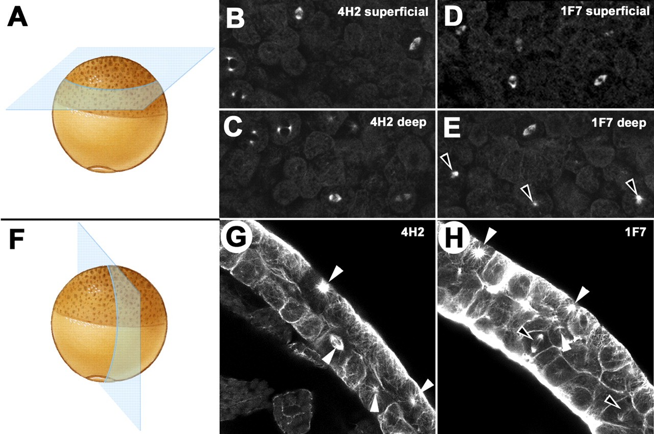 Fig. 10. FN is required for mitotic spindle orientation. (A) Cartoon of stage 11.5 embryo, showing approximate plane of confocal sections (oblique) through the BCR epithelium to visualize en face views of mitotic spindles in both superficial (B,D) and deep (C,E) cell layers. In control (4H2 injected) embryos, the spindles in the superficial (B) and deep (C) cell layers are oriented parallel to the BCR inner surface. In embryos injected with mAb 1F7, spindle orientation in the superficial layer is within the plane of the BCR epithelium (D), while in the deep layers mitotic spindle orientation is randomized (E; arrowheads indicate spindles that are out of the horizontal plane of the epithelium. (F) Cartoon of sagittal confocal section through gastrula embryo. The BCR is two layers thick and the mitotic spindles are in the plane of the epithelium in both cell layers of control embryos injected with mAb 4H2 (G; white arrowheads). In embryos injected with mAb 1F7, spindle orientation in the deep layers is randomized (H; black arrowheads indicate spindles that are not in the plane of the epithelium, while white arrowheads indicate spindles that orient in the plane of the epithelium). Note that arrowheads with asterisks (G,H) indicate spindles in the horizontal plane of the epithelium but the view is down the long axis of the spindle. Fluorescence along the inner BCR surface in B is artifactual and due to precipitation of primary mAb that occasionally occurs during whole embryo fixation. |