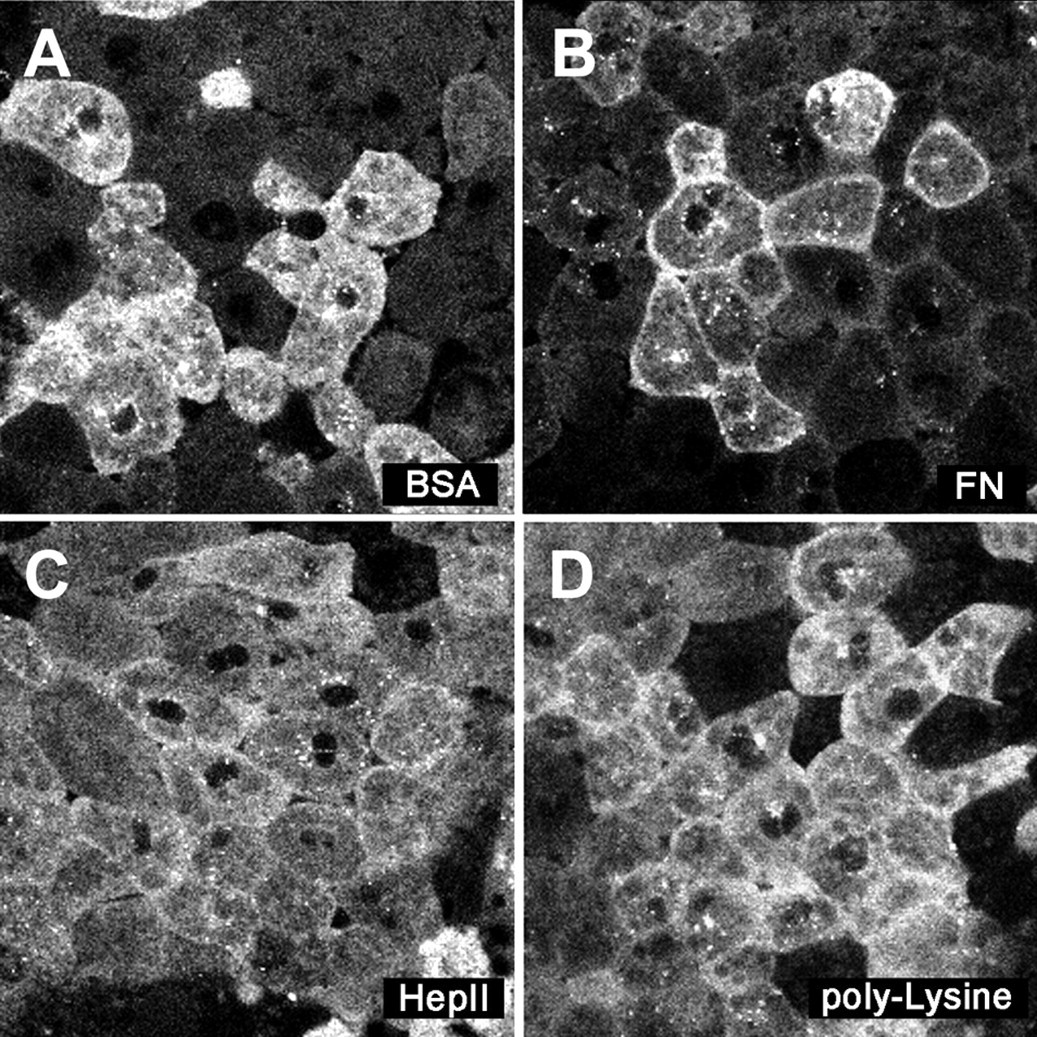 Fig. 11. FN is permissive for XDsh relocalization in the BCR. Embryos were injected with 50 pg of XDsh-GFP RNA. Stage 10 explanted tissue was placed on FN or BSA substrates and examined by confocal microscopy. (A) DMZ tissue placed on BSA shows a granular cytoplasmic localization of XDsh-GFP after 60 minutes. (B) DMZ tissue placed on FN. XDsh-GFP is localized to the cell membrane after 60 minutes. (C) DMZ on the HepII-GST fusion protein. XDsh remains cytoplasmic after 60 minutes. (D) DMZ on poly-L-lysine. XDsh-GFP remains cytoplasmic after 60 minutes. |