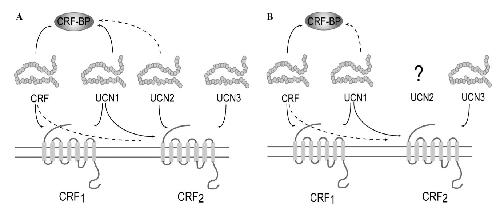 their receptors (CRF1 and CRF2), and the CRF binding protein (CRF-BP). The question mark indicates that a urocortin 2 gene has not yet been