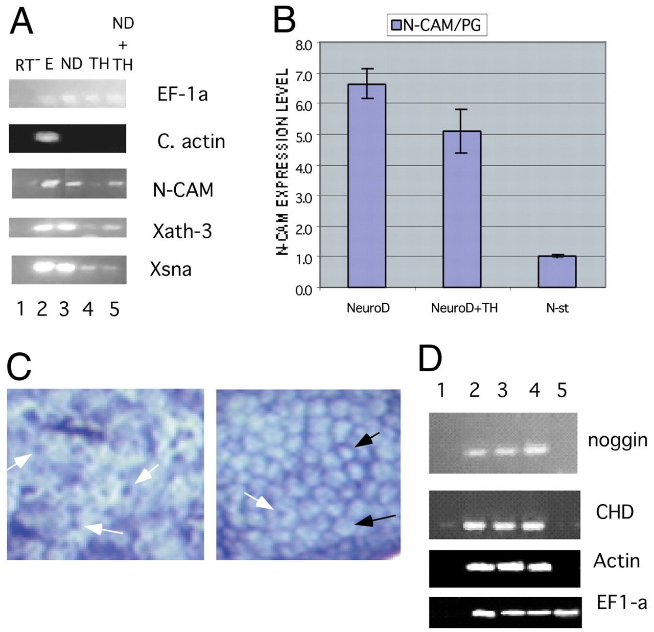 Fig. 4. Effect of TH on expression of neural markers in animal caps. (A) RT-PCR analysis of RNA isolated from animal caps overexpressing NeuroD (lane 3) showing induction of neural markers NCAM, Xath-3 and Xsnail (Xsna). TH alone did not induce any neural markers (lane 4); Co-injection of both NeuroD mRNA and TH mRNA resulted in an inhibition of the differentiated and neural crest markers, Xath-3 and Xsnail, respectively, but did not inhibit the pan-neural marker NCAM (lane 5). Lane 1 is an RT-negative control, while lane 2 is a control lane of embryo RNA. (B) Quantitative RT-PCR showing the levels of NCAM mRNA expression in NeuroD-, and NeuroD- and TH-injected animal caps. N-st are non-injected caps. (C) Animal caps that were immunostained with anti-TH antibody. The panel on the left shows control animal caps; the panel on the right shows animal caps from embryos injected with NeuroD mRNA at the four- to eight-cell stage. Black arrows indicate the cell periphery; white arrows, nuclei. (D) The effect of TH on animal caps induced with activin. Animal caps from embryos that were injected with TH mRNA into the animal blastomeres or uninjected embryos were dissected at stage 8 and treated with activin. Lane 1 is an RT-negative control; lane 2 contains RNA from embryos as a positive control; lane 3 contains RNA from animal caps treated with activin; lane 4 contains RNA from embryos overexpressing TH and treated with activin; lane 5 contains RNA from control untreated animal caps. |