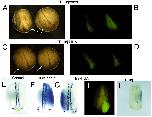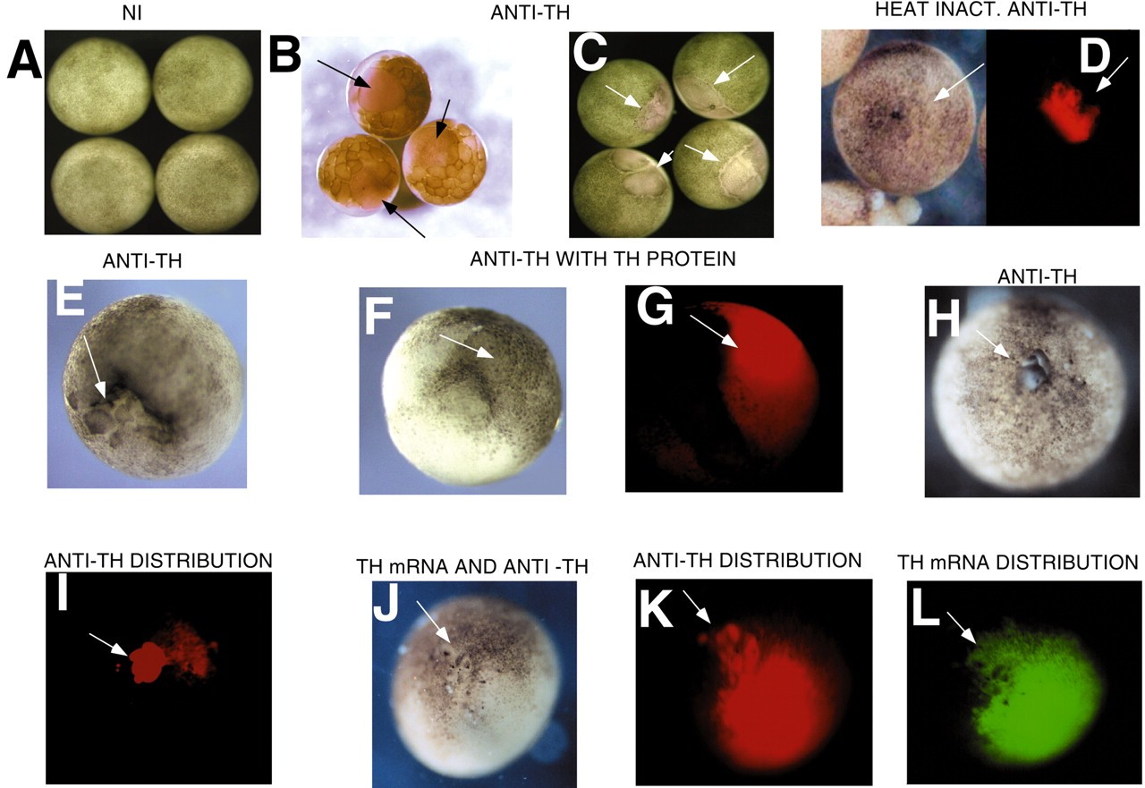 Fig. 8 Loss-of-function analysis of TH. (A) Non-injected stage 9 embryos. (B,C) Stage 7 and stage 9 embryos, respectively, injected with the anti-TH antibodies and rhodamine-derived dextran at the four-cell stage. This was photographed under both u.v. and incandescent light to show the presence of the rhodamine in injected blastomeres (arrows). (D) On the left is a stage 9 embryo injected with heat-inactivated anti-TH antibody. On the right co-injected rhodamine dextran (arrows) shows the location of the injected antibody. (E) Stage 8 embryo injected with anti-TH antibody at the 16 cell stage. The arrow indicates the enlarged blastomeres. (F) Stage 8 embryo injected with a mixture of the anti-TH antibody and purified TH protein. (G) u.v. microscopy image of the same embryo as in F, showing the distribution of the injected mixture (arrows). (H,I) Stage 8 embryo injected with anti-TH antibody at the 16-cell stage showing large blastomeres (arrow in H) and showing location of the antibody (arrow in I). (J,K,L) Stage 8 anti-TH antibody injected embryo rescued by injection of TH mRNA showing normal size blastomeres (arrow in J) in area where the TH mRNA was injected. (K) Distribution of the anti-TH antibody in the embryo, as indicated by rhodamine-conjugated dextran. (L) Distribution of TH mRNA, as indicated by presence of GFP in embryo. The cells in which there is less TH mRNA (arrow) appear larger than those receiving larger amounts of the mRNA. |