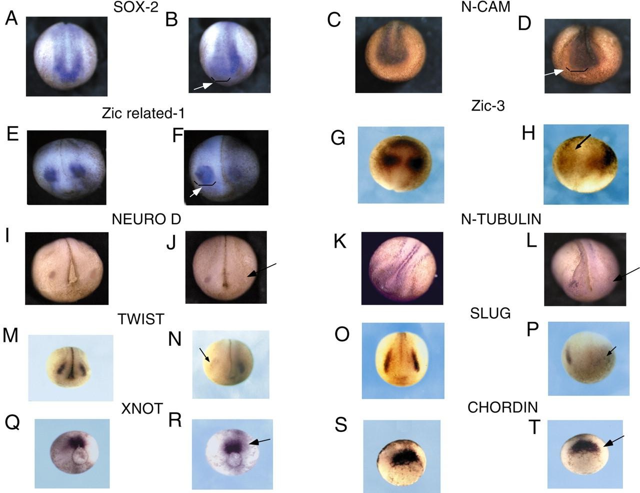 Fig. 3. Effect of TH overexpression on molecular markers. (A-H) Effect of TH on expression of early neural markers. (A) Control embryo at stage 15 showing normal in situ hybridization pattern of Xsox-2. (B) Xsox-2 expression is expanded on side of embryo that is overexpressing TH (arrow and brackets). (C) Control embryo at stage 16 showing normal in situ hybridization pattern of NCAM. (D) NCAM expression is expanded in TH overexpressing region (arrow and brackets). (E) Normal pattern of Zic-related-1 mRNA in stage 17 embryo. (F) Expanded region of Zic-related-1 expression in TH-injected embryo (arrow and brackets). (G) Normal pattern of Zic3 mRNA in stage 14 embryo. (H) Inhibition of Zic3 in region overexpressing TH (arrow). (I-L) Effect of TH overexpression of late neural markers: (I) control stage 18 embryo hybridized with NeuroD probe; (J) inhibition of NeuroD on side of embryo overexpressing TH (arrow); (K) control stage 18 embryo showing the pattern of expression of N-tubulin mRNA; (L) inhibition of N-tubulin on side of embryo overexpressing TH (arrow). (M-T) Effect of TH on neural crest and mesoderm markers: (M) control stage 18 embryo probed by in situ hybridization with the Xtwist probe showing normal pattern of twist mRNA; (N) inhibition of twist in region overexpressing TH (arrow); (O) control embryo showing the expression of Xslug mRNA; (P) inhibition of Xslug mRNA in region overexpressing TH (arrow); (Q) normal pattern of Xnot mRNA expression in stage12 embryo; (R) normal pattern of Xnot expression in embryo overexpressing TH (arrow); (S) normal pattern of chordin mRNA expression in stage 10.5 embryo; (T) normal pattern of chordin expression in area overexpressing TH (arrow). |