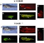 Fig. 5. Effect of TH overexpression on the endoderm and mesoderm. (A-E) Embryos that were injected at the four-cell stage with TH RNA into blastomeres giving rise to the endoderm. (A) Embryo in which TH was overexpressed in the endoderm in which we did not detect any abnormalities in endodermally derived structures. (B) The same embryo showing the rhodamine dextran lineage tracer co-injected with the TH mRNA. (C) Section of the embryo in A and B showing the rhodamine dextran and the normal nature of the endodermal cells (arrow) overexpressing TH. Arrows in A and B indicate the approximate position of the section in C. Arrow in C indicates to the endodermal cells. (D,E) Embryo injected with a mixture of TH and GFP mRNAs at the four-cell stage. (D) The distribution of the GFP. (E) A light microscopy image showing that the endodermal region of the tadpole appears normal. The arrows in D,E point to the region overexpressing the GFP and TH. (F-J) The effect of overexpressing TH in mesoderm. (F-H) The same embryo co-injected with TH mRNA and rhodamine dextran at the four-cell stage into a blastomere giving rise to the mesoderm. (F) Light microscopy image. (G) The distribution of the lineage tracer, rhodamine dextran in the axial muscle. (H) A section of the same embryo. The arrows indicate the same position in the tadpole in each panel. (I,J) A tadpole in which GFP and TH mRNAs were co-injected into the four-cell stage embryo. The TH is overexpressed in the notochord. In both instances there were no abnormalities detected within the mesodermally derived tissues, which were overexpressing TH. |