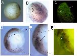 Fig. 6. Overexpression of TH increases cell proliferation. Embryos were injected with Myc-tagged TH mRNA into one blastomere of the four-cell stage embryo. Stage 14 embryos were immunostained with an antibody against phosphorylated histone H3 to detect mitotic cells. (A) Control embryo showing the normal distribution of mitotic cells. (B) Stage 14 treated embryo showing a distinct patch of mitotic cells in one region of the embryo. (C) The same embryo as in B immunostained with the Myc tag antibody to detect the distribution of exogenous TH protein. The arrows on the left point to H3 positive nuclei as landmarks. The arrow on the right points to the border of the TH-expressing cells, which coincides with the border of the mitotically active cells. (D-F) The same embryo as in B, dissected to show the coincident expression of TH with the mitotically active cells. (D) Light microscopy view of the dissected embryo. (E) A higher magnification view. (F) The embryo viewed under u.v. light to detect the fluorescein labeled Myc-tagged TH protein and partial light to visualize the distribution of the H3-positive nuclei. The white arrow points to the area showing of both the TH protein (green) and the H3-positive nuclei. The black arrow points to the region not expressing TH and not showing the H3-positive marker. These cells are all of the same germ layer. |