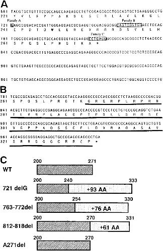 Figure 3. Sequence and structure of the wild-type (WT) and mutant AQP2 cDNAs. Nucleotide and amino acid residue numbers correspond to the cDNA; the A of the initiator Met codon is nucleotide 1. A, Nucleotide and amino acid sequence at the C-terminal site of wild-type AQP2. The boxed bases are the deleted bases detected in patients with NDI who are included in the present study. One, ten, and seven nucleotides were deleted, starting at 721 (721delG), 763 (763–772del), and 812 (812–818del), respectively. B, Sequences of the C-terminus in 812–818del. This mutation shifted the stop codon 180 nucleotides downstream, resulting in an addition of 61 new amino acids (underlined) to the terminal end. C, Schematic structure of mutant AQP2s. The frameshift mutations 721delG, 763–772del, and 812–818del result in the addition of 93, 76 and 61 new amino acids, respectively. Because the number of deleted bases were 3×n+1 (n=0, 2, or 3), 61 C-terminal amino acids are common in these three mutants. All of the three AQP2 mutants lack the last amino acid of the wild-type AQP2 (alanine at codon 271).