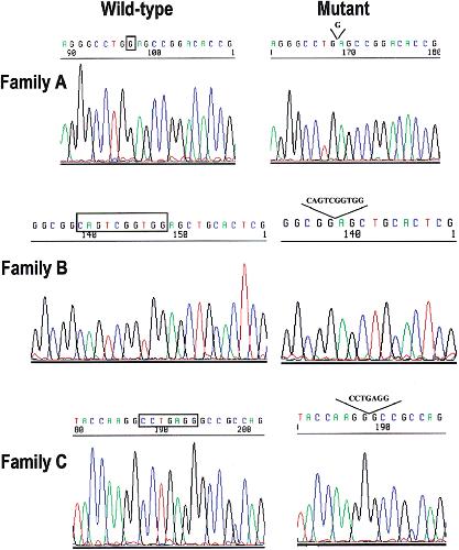 Figure 2. DNA sequencing of the mutated regions of the AQP2 gene found in three families with NDI.