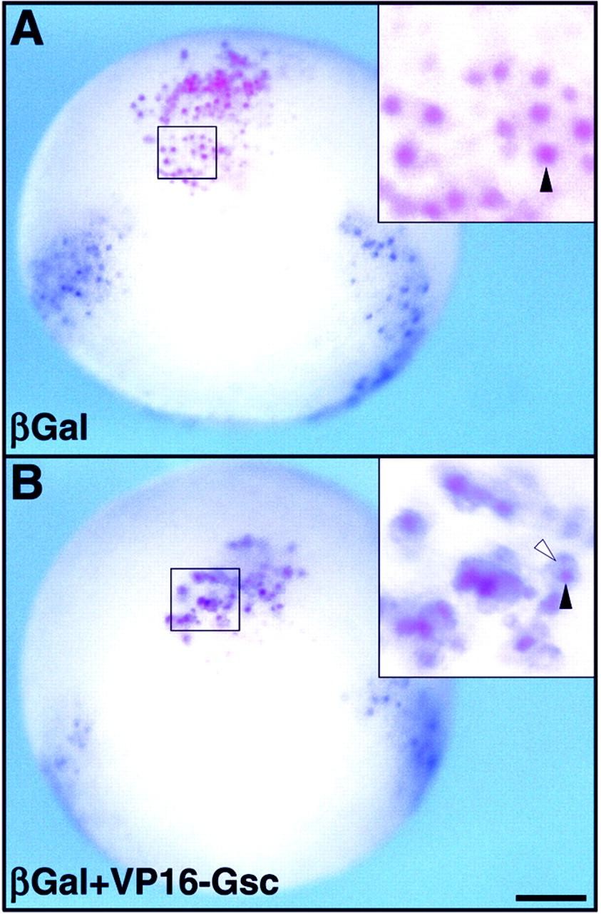 Fig. 5. Cell autonomous activation of Xwnt8 by VP16-Gsc. At the 16-cell stage, one dorsal marginal zone blastomere was injected with 750 pg of β-galactosidase (β-gal) mRNA (A) or a combination of β-gal and 500 pg of VP16-Gsc (B). Descendents of the injected cell were identified at the gastrula stage by the presence of β-gal, using the Rose-gal substrate. Activation of Xwnt8 by VP16-Gsc in the dorsal marginal zone and endogenous ventrolateral expression of Xwnt8 was detected by in situ hybridization with BM-purple substrate (A,B). Dorsal views of stage 10.25 embryos with endogenous Xwnt8 expression visible in lateral regions. Insets show higher magnification views of boxed regions. Black arrowheads indicate β-gal-positive nuclei (red) and the white arrowhead indicates cytoplasmic Xwnt8 in situ stain (purple). Scale bar: 0.25 mm; 80 μm in the insets. |