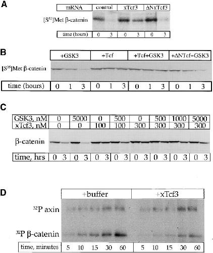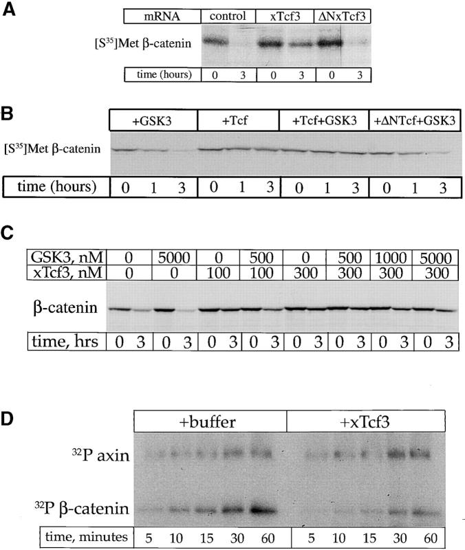 Figure 1. Tcf3 blocks β-catenin degradation in extracts and phosphorylation in vitro. (A) Translated Tcf3 but not ÎNTcf3 mRNA inhibits β-catenin degradation in extracts. (B) Purified Tcf3 protein (1 μM) blocks β-catenin degradation. This effect was not reversed by 1 μM GSK3. Purified ÎNTcf3 (1 μM) does not block β-catenin degradation. (C) Inhibition of β-catenin degradation by lower (100 nM) Tcf3 levels can be partially rescued by GSK3; higher Tcf3 (300 nM) levels cannot be rescued by even a large GSK3 excess. (D) Tcf3 inhibits the phosphorylation of β-catenin by GSK3 and axin in a purified system. In the same reaction, axin phosphorylation by GSK3 is not affected by Tcf3.