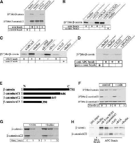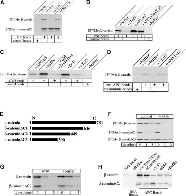 Figure 2. Tcf3 competes with axin/APC for β-catenin (cold competitors were present at 1 μM in all experiments). (A) Binding of β-catenin to axin beads is inhibited by Tcf3 but not by ÎNTcf3. In contrast, binding of the β-catenin ÎC2 mutant to axin is unaffected by Tcf3. (B) Tcf3 blocks the binding of β-catenin to axin beads, whereas APCm3 reverses this effect of Tcf3. (C) APCm3 inhibits the binding of β-catenin to Tcf3 beads. (D) 1 μM his6-TCF3 blocks the interaction of β-catenin with endogenous APC in extracts, whereas his6-ÎNTcf3 has no effect. (E) Scheme of the COOH-terminal β-catenin deletion constructs used to map the fragment of β-catenin responsible for stabilization by Tcf3. (F) Normal and axin-induced degradation of β-catenin, β-cateninÎC2, and β-cateninÎC3 in Xenopus extracts. β-cateninÎC3 is completely stable and does not respond to axin. (G) Axin stimulates the turnover of both β-catenin and β-cateninÎC2 in the same degradation reaction. (H) β-catenin and β-cateninÎC2 both bind to APC and binding is not disrupted by the Tcf4 NH2-terminal peptide or by the cat449/645 fragment (at <2 μM).
