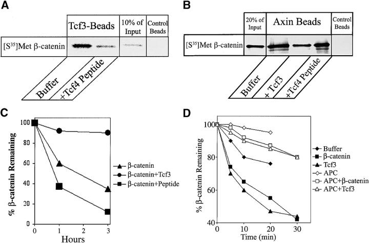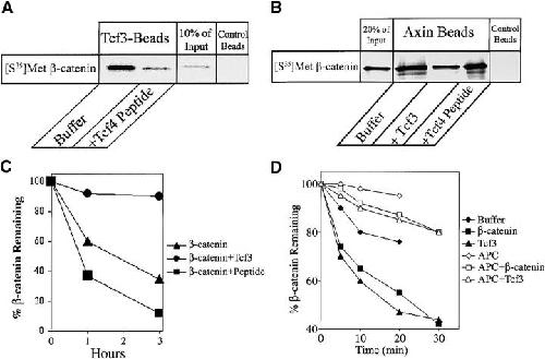 Figure 4. Effects of an NH2-terminal Tcf4 peptide on β-catenin stability and rate of axinâβ-catenin dissociation. (A) β-catenin binding to xTcf3 beads is inhibited by an NH2-terminal Tcf4 peptide (10 μM). (B) In contrast, β-catenin binding to axin is unaffected by the presence of the NH2-terminal Tcf4 peptide but is blocked by cold Tcf3. (C) Addition of the NH2-terminal Tcf4 peptide (2 μM) to Xenopus extracts stimulates β-catenin degradation, which is in contrast to the inhibitory effect of Tcf3 (500 nM). (D) Half-life of the axinâβ-catenin complex. Radiolabeled β-catenin bound to axin beads (in the presence or absence of 100 nM APC) was incubated with buffer, cold Tcf3 (2 μM) or cold β-catenin (2 μM) at room temperature. The β-catenin remaining on beads was measured as a function of time.