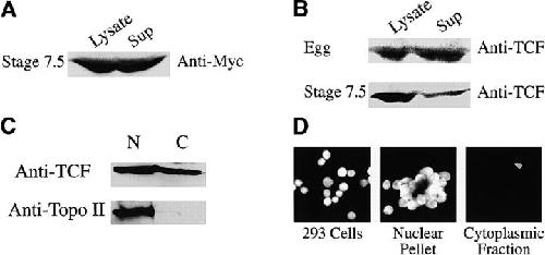 Figure 5. A significant fraction of total cellular TCF protein in Xenopus embryos and in cultured cells is nonnuclear. (A) Both cells of 2-cell embryos were injected with myc6-Tcf3 RNA (250 pg/ blastomere), gently homogenized at stage 7.5 (lysate), and centrifuged to pellet the nuclei (Sup). Equivalent volumes of lysate and supernatant were subsequently processed for Western analysis using an anti-myc antibody. Most of the detected myc-tagged Tcf3 is present in the supernatant fraction. (B) Xenopus eggs and stage 7.5 embryos were processed as described for the myc6-Tcf3 RNA injected embryos except that an anti-Tcf antibody was used to detect endogenous Tcf. Nearly all of the Tcf detected is present in the supernatant fraction of eggs in contrast to stage 7.5 embryos. Lysates and supernatants were stained with Hoechst to confirm the presence (lysates) or absence (supernatants) of intact nuclei (unpublished data). Nuclear and cytoplasmic preparations from cultured 293 cells were blotted for topoisomerase II (C) and Tcf and stained with Hoechst (D). The nuclear pellet was brought to the same volume as the cytoplasmic fraction, and equivalent volumes were used for Western analysis.