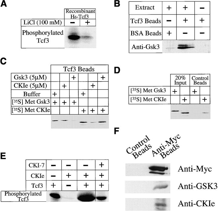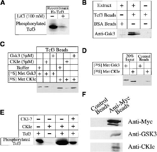 Figure 6. GSK3 and CK1ε bind and phosphorylate Tcf3. (A) Tcf3 purified from Sf9 cells contains lithium-sensitive kinase activity. Recombinant his6-Tcf3 (1μg) was incubated in 10 μl kinase buffer (described in Materials and methods) for 30 min at room temperature either in the presence or absence of 100 mM LiCl, which normally inhibits GSK3 activity. Phosphorylation of Tcf3 is dramatically decreased in the presence of lithium. (B) Tcf3 beads pull down GSK3 from Xenopus extracts. Beads (control-BSA or Tcf3-coupled) were incubated with Xenopus egg extracts, washed, eluted, and analyzed by Western blotting with a monoclonal anti-GSK3 antibody. (C) Both GSK3 and CK1ε bind Tcf3. Radiolabeled in vitro–translated GSK3 and CK1ε bind Tcf3 beads. Binding of radiolabeled GSK3 and CK1ε to Tcf3 beads was abolished by addition of excess cold protein (5 μM of his6-GSK3 and MBP-CK1ε, respectively), demonstrating specificity of the binding reaction. However, excess cold his6-GSK3 does not block CK1ε binding to Tcf3, whereas excess cold MBP-CKIε fails to block GSK3 binding to Tcf3, which suggests the existence of independent nonoverlapping sites for GSK3 and CK1ε binding on Tcf3. (D) CK1ε can phosphorylate Tcf3. Incubating Tcf3 with MBP-CK1ε enhances its phosphorylation. Endogenous kinase activity seen for Tcf3 alone reflects copurification of GSK3. (E) The enhancement of Tcf3 phosphorylation by CK1ε can be readily reversed by addition of CKI-7 (100 μM), a specific CK1 inhibitor, which indicates that Tcf3 is a substrate for both GSK3 and CK1ε. (F) Both GSK3 and CK1ε coimmunoprecipitates with myc-tagged Tcf3. Both cells of 2-cell embryos were injected with myc6-Tcf3 RNA (500 pg/blastomere), homogenized at stage 7.5, and precipitated with either anti-myc antibodies coupled to beads or to control beads. Western blotting with antibodies against GSK3 and CK1e indicates that both proteins coimmunoprecipitates with myc-tagged Tcf3 protein.