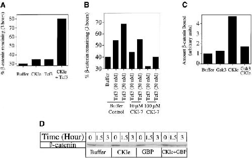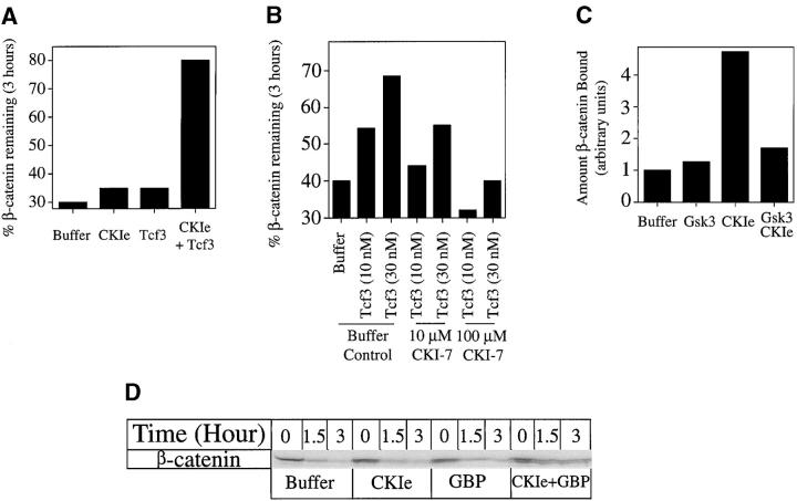 Figure 7. Effect of CK1ε on Tcf3â β-catenin interaction. (A) Tcf3 and CK1ε act synergistically to inhibit β-catenin degradation. His6-Tcf3 (3 nM) and MBP-CK1ε (200 nM) were added to Xenopus extracts either alone or together. Inhibition of β-catenin degradation is dramatically enhanced by addition of both Tcf3 and CK1ε (nearly 80% remaining after 3 h) compared with addition of either Tcf3 or CK1ε alone (35% remaining after 3 h). (B) The CK1ε inhibitor CKI-7 inhibits the effect of Tcf3 or β-catenin stabilization. CKI-7 inhibits the effects of 10 and 30 nM Tcf3 in a dose-dependent manner. At high CKI-7 concentrations (100 μM), the effect of Tcf3 is abolished and β-catenin degradation is actually stimulated when compared with the buffer control. (C) CK1ε stimulates the binding of Tcf3 to β-catenin. Preincubation of Tcf3 beads with 1 μM CK1ε in kinase buffer stimulates its binding to β-catenin (compared with preincubation in buffer alone). This effect of CK1ε was decreased by addition of 1 μM GSK3 to the kinase reaction. GSK3 by itself had no effect on the binding of Tcf3 to β-catenin. A nearly fivefold increase in the binding of Tcf3 to β-catenin is seen when Tcf3 beads were preincubated with CK1ε. (D) CK1ε acts synergistically with GBP to inhibit β-catenin degradation. 50 nM GBP or 200 nM CK1ε has no effect on β-catenin degradation; however, together they dramatically inhibit β-catenin degradation in extracts.