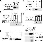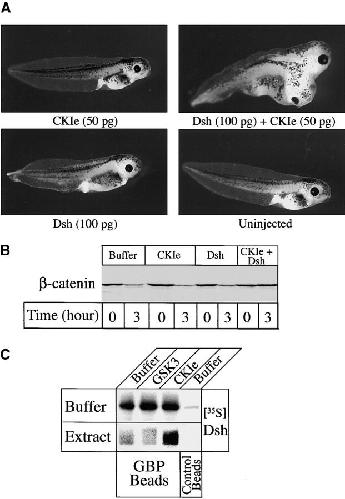 Figure 8. Role of CK1ε in mediating dsh activity. (A) dsh acts synergistically with CK1ε in Xenopus embryos to induce axis duplication. Embryos were injected with 50 pg CK1ε, 100 pg dsh, or 50 pg CK1ε plus 100 pg dsh RNA in one ventralblastomere of 4â8-cell stage embryos. (B) Dsh and CK1e act synergistically to inhibit β-catenin degradation. Dsh protein (100 nM) and CK1e protein (500 nM) were added to extracts alone or in combination. (C) GBP cross-linked beads were incubated with radiolabeled dsh and either buffer, 1 μM CK1ε, or 1 μM GSK3 in the presence or absence of Xenopus extracts. CK1ε stimulates the binding of GBP to radiolabeled dsh in Xenopus extracts. No differences were detected when binding was performed in the absence of extracts.