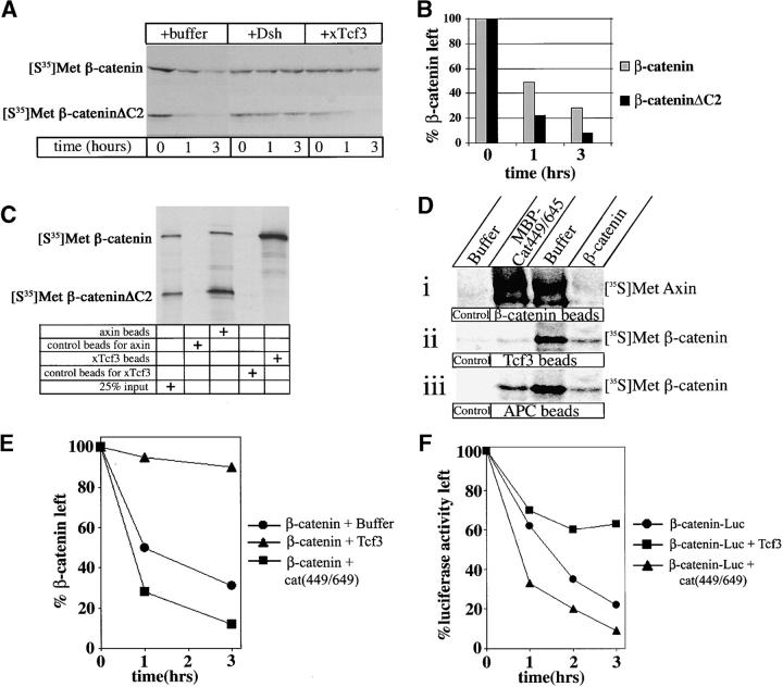 Figure 3. Effects of Tcf3 on β-catenin mutants. (A) Degradation of both β-catenin and β-cateninÎC2 is inhibited by 1 μM dsh, but only β-catenin is inhibited by 1 μM Tcf3. (B) Graphical representation of densitometry measurements of the autoradiogram in A shows the faster degradation rate of β-cateninÎC2 compared with β-catenin. (C) Both β-catenin and β-cateninÎC2 bind to axin, but only β-catenin binds to xTcf3 in vitro. (D) MBP-cat449/645 inhibits by >95% the binding of [35S]methionine-labeled β-catenin to Tcf3 in vitro (ii). MBP-cat449/645 (2 μM) had no effect on the binding of axin to β-catenin beads (i) and a moderate effect on the binding of β-catenin to APC beads (iii). Binding of radiolabeled β-catenin and axin to control beads was negligible. (E) Degradation of radiolabeled β-catenin in Xenopus extracts is stimulated by MBP-cat449/645 (200 nM). (F) β-cateninâluciferase is degraded more rapidly in embryos when coinjected with MBP-cat449/645. β-cateninâluciferase (4 ng) protein was injected into 2-cell stage Xenopus embryos with or without MBP-cat449/645 (4 ng). At the indicated times, embryos were processed for luciferase assays.