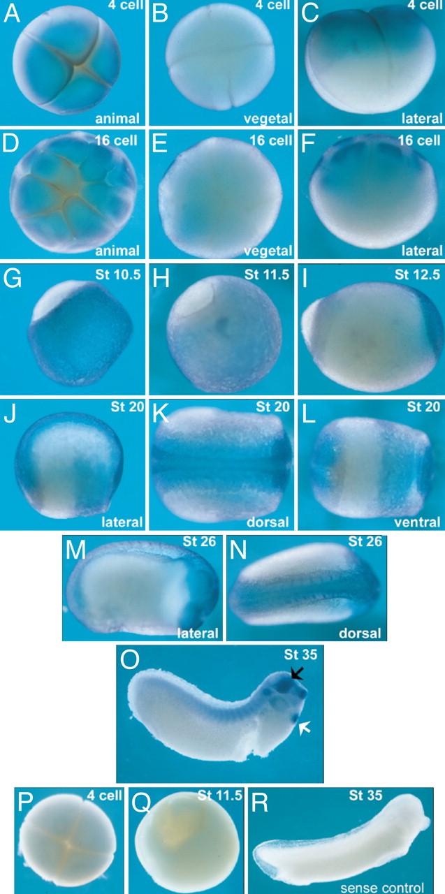Fig. 1. Whole-mount in situ hybridization analysis of Xbves expression. A four-cell embryo is seen from the animal (A) and vegetal (B) poles and from the lateral side (C). A 16-cell embryo is seen from the animal (D) and vegetal (E) poles and from the lateral side (F). Xbves expression is observed in the surface epithelium in gastrulation stage embryos but is excluded from the yolk plug (G and H) and a more restrictive dorsal expression pattern in neurulation stage (I). Lateral view, dorsal view, and ventral view of embryos at stages 20 (JâL) and 25 (M and N) demonstrates Xbves distribution. Xbves expression in the heart (white arrow), eye (black arrow), cement gland, and somites of a stage 35 embryo (O). Control sense probe hybridization of four-cell (P), stage 11.5 (Q), and stage 35 embryos (R) are negative.