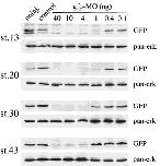 Morpholino (MO) based inhibition of translational initiation represents an attractive methodology to eliminate gene function during Xenopus development (Heasman et al., 2000). However, the degree to which a given target protein can be eliminated and the longevity of this effect during embryogenesis has not been documented. To examine the efficacy of MOs, we have used transgenic Xenopus lines that harbour known numbers of integrations of a GFP reporter under the control of the ubiquitous and highly expressed CMV promoter (Fig. 1a). In addition we have investigated the longevity of the inhibitory effect by using transgenic lines expressing GFP specifically in the lens of tadpoles. These transgenic lines represent the ideal control for the technique as the promoters are highly expressed and GFP can be easily detected by fluorescence and immunoblotting. Moreover, as GFP has no function in development, the levels of inhibition can be tested in an otherwise normal individual. Here we report that MOs are able to efficiently and specifically inhibit the translation of GFP in transgenic lines from Xenopus laevis and Xenopus tropicalis and the inhibitory effect is long-lived, lasting into the tadpole stages. genesis 30:110--113, 2001.