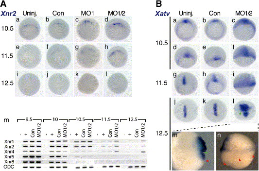 Fig. 3. Xatv depletion increases and prolongs Xnr expression levels and Xnr signaling. (A) XatvMO1 + MO2-injection upregulates and maintains Xnr1 and Xnr2 expression during gastrulation. (a–l) In situ hybridization (vegetal pole views) with Xnr2 in (a, e, i) uninjected or (b, f, j) control MO (60 ng)-injected embryos compared to those injected with (c, g, k) XatvMO1 alone (60 ng). [Quantitative analysis of alterations shown: c, n = 5/5; g, n = 6/6; k, n = 8/8.] (d, h, l) XatvMO1 + MO2 (30 ng each; quantitation: d, n = 14/15; h, n = 10/13; l, n = 13/13). Note the stronger Xnr2 signal in XatvMO1 + MO2-injected embryos than in XatvMO1-injected embryos. (m) RT-PCR with total RNA from whole embryos injected with 60 ng control MO, or 30 ng of each XatvMO1 and XatvMO2 (− RT, + RT controls are from uninjected embryos). (B) Xatv expression is increased and expanded in XatvMO1 + MO2-injected embryos during gastrulation. (a–c) Vegetal views. (d–l) Dorsal views. [Quantitation: c, n = 13/15; i, n = 21/23, l, n = 13/15.] (m, n) XatvMO1 + MO2-injected embryos at St. 12.5 were bisected longitudinally through the center of the Xatv expression domain after whole-mount in situ hybridization and viewed either (m) internally or (n) externally (green arrowheads, indentation of the superficial layer (see text); red arrowheads, epiboly margin). |