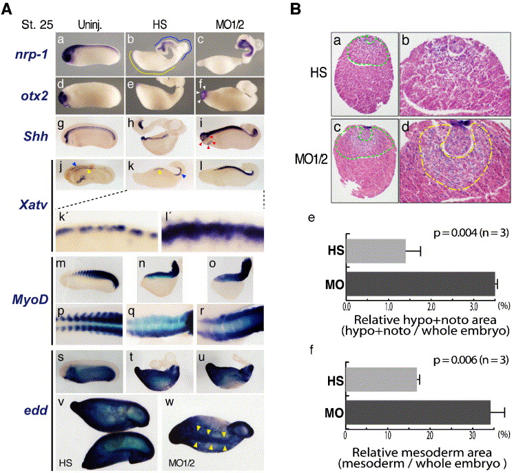 Fig. 6. Xatv is essential for proper formation of mesodermal tissues at later embryogenesis. Classical exogastrulae were induced by incubating embryos with high salt (HS) solution. XatvMO1 + MO2-injected embryos (30ng each) were incubated in 1Ã SS without vitelline membranes. When sibling embryos reached stage 25, exogastrulae were collected. (A) In situ hybridization. (aâc) nrp-1 expression. [Quantitative analysis of alterations shown: b, n = 4/5; c, n = 7/8.] Yellow and blue lines in panel b indicate the protruded mesendodermal mass and ectoderm, respectively. (dâf) Xotx2 expression. White arrowheads in panel f indicate the expanded prechordal plate in the anterior end. [Quantitation: e, n = 5/5; f, n = 9/9.] (gâi) Shh expression. Red arrowheads in panel i indicate the expanded prechordal plate in head mesoderm. [Quantitation: h, n = 8/11; i, n = 14/18.] (jâl) Xatv expression. [Quantitation: k, n = 5/7; f, n = 10/15.] Yellow and blue arrowheads in panel j: Xatv expression at the hypochord and neural tube floorplate, respectively. Yellow and blue arrowheads in panel k: Xatv signal at the dorsal mesendodermal mass and mesendodermal mass/ectoderm junction, respectively. (kâ², lâ²) Magnified views of panels k and l, respectively. (mâr) MyoD expression. [Quantitation: n, n = 6/6; o, n = 19/19.] (sâw) edd expression. Yellow arrowheads in panel w indicate the intense staining in axial mesoderm. [Quantitation: t, n = 9/9; u, n = 18/18.] (aâo, sâu) Lateral views, anterior left, dorsal upward. (pâr) Magnified dorsal view of panels mâo, respectively. (v, w) Dorsal views. (B) Histological morphology and relative volume of notochord + hypochord and mesodermal tissues in HS and XatvMO1 + MO2-induced exogastrulae. (aâd) Hematoxylin/eosin staining of exogastrulae after transverse sectioning (after whole-mount in situ hybridization for Xatv). Green dashed lines in panels a and c encircle the mesoderm area including somite and ventral mesodermal cells. (b, d) Magnified views of dorsal side of panels a and c, respectively. Yellow dashed line in panel d indicates the crescent-shaped tissue containing elongated cells and nuclei that are indicative of somitic muscle differentiation, which is less obvious within somitic mesoderm area in the HS-induced exogastrulae. (e, f) Comparison of the relative volume of hypochord + notochord area (e) and mesodermal area (f) between HS- and XatvMO1 + MO2-induced exogastrulae. |