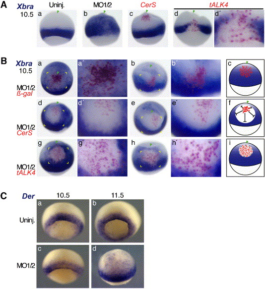 Fig. 7. Evidence for the expansion of Xbra expression by long-range Xnr signaling after Xatv knockdown. (A) In situ hybridization with Xbra on embryos at St. 10.5. (a) Uninjected embryo. (b) XatvMO1 + MO2-injected embryo. (c) CerS-injected embryos. (d) tALK4-injected embryo. (d′) High magnified view of panel d. (a–d) Lateral views. Red-gal staining in panels c and d detects the descendents of the cell injected with CerS and tALK4, respectively. (B) Xnr-specific inhibitors prevent ectopic Xbra expression in Xatv-deficient embryos. In situ hybridization on embryos at St. 10.5 detects Xbra expression, with red-gal staining detecting the descendants of the cell injected with RNA encoding the inhibitor (see text for detailed experimental design). Injection of β-gal (250 pg) does not affect ectopic Xbra expression (a–b′). CerS (500 pg) inhibits ectopic Xbra expression non-cell autonomously (d–e′), whereas tALK4 (500 pg) suppresses the ectopic Xbra expression cell autonomously (g–h′). (c, f, i) Simplified diagrams showing the effects on ectopic Xbra expression by β-gal, CerS, and tALK4, respectively. Red dots represent the clone of cells that express β-gal, CerS, and tALK4, respectively. “⊥” symbols in panels f and i show inhibition of Xnr signaling non-cell and cell autonomously by CerS and tALK4, respectively. (a, e) Animal views. (b, d, g, h) Lateral views skewed ∼45° animal-ward. (a′, b′, d′, e′, g′, h′) Magnified views of the yellow bracketed area of panels a, b, d, e, g, and h, respectively. Green arrowheads in panels A and B indicate animal pole. (C) In situ hybridization with Der in (a, b) uninjected and (c, d) XatvMO1 + MO2-injected embryos. Dorsal views, with (d) angled downward slightly to visualize the animal-ward extent of Der signal. |