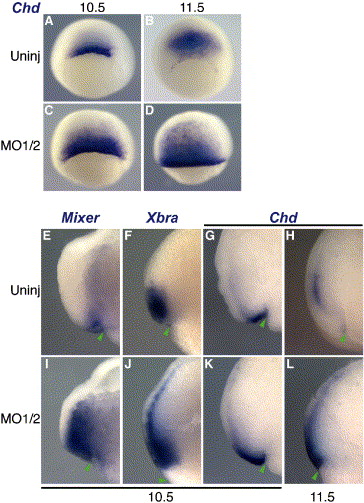 Supplemental Fig. 3. Expression of Chd, Xbra, and Mixer in XatvMO1 super + MO2-injected embryos. (A–D) Whole-mount in situ hybridization, Chd probe (dorsal views). During gastrulation, Chd expression is highly upregulated and expanded towards the animal side in XatvMO1 + MO2-injected embryos (C; n = 19/22, D; n = 15/17). (E–L) Comparison of the expression of organizer and mesendodermal markers. (E, F, I, J) Mixer and Xbra in situ hybridizations were performed with embryos after sagittal bisection through the center of the dorsal lip (I, n = 10/10; J, n = 9/10). (G, H, K, L) Embryos were sagittally bisected after whole-mount in situ hybridization, through the center of the Chd expression domain seen in panels A–D (green arrowheads indicate dorsal lip). |