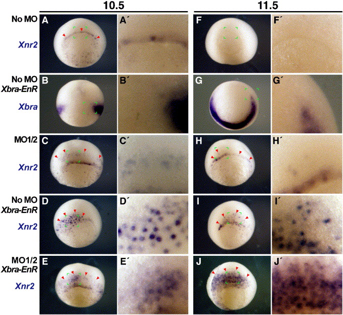 Supplemental Fig. 4. Xatv and Xbra synergistically regulate Xnr expression during gastrulation. The experimental method is the same as that in Fig. 8. To show more clearly the increased Xnr2 signal intensity caused by Xbra-EnR in the background of reduced Xatv/Xlefty function, the β-gal RNA injection and red-gal staining were omitted. Expression of Xnr2 and Xbra was analyzed by in situ hybridization at St. 10. 5 (A–E) and St. 11.5 (F–J). (A, C, D, E) Xnr2 expression at St. 10.5 after injecting the reagent combinations shown in black on the left side of the panels. All dorsal views, except (A) vegetal view, dorsal to the top. (B) Xbra expression at St. 10.5 after injecting Xbra-EnR. Dorsal view. (A′–E′) Magnified views of bracketed areas in panels A–E, respectively. [Quantitation: A, n = 18/20; B, n = 12/12; C, n = 20/20; D, n = 23/23; E, n = 21/22] (F, H, I, J) Xnr2 expression at St. 11.5 after injecting reagent combinations in black. Dorsal views, tilted upward. (G) Xbra expression, St. 11.5, after injecting Xbra-EnR. Vegetal view. (F′–J′) Magnified views of bracketed areas in panels F–J, respectively. [Quantitation: F, n = 19/19; G, n = 10/10; H, n = 19/19; I, n = 24/24; J, n = 27/31] Red arrowheads: animal limit of visible Xnr2 signal. The increased intensity of Xnr2 signal (punctate perinuclear staining) and expanded expression domain of Xnr2 in Xbra-EnR-injected embryos indicate that Xbra affects Xnr autoregulation at the transcriptional level (D, D′, E, E′). Xnr2 expression was expanded farther in MO1/MO2+Xbra-EnR-injected embryos with more elevated signal intensity than in the other conditions, demonstrating the multiple influences on Xnr expression by Xatv and Xbra (E, E′, J, J′). Note: The apparently minor effect on Xnr2 expansion between the MO1/MO2 + Xbra-EnR-injected condition compared to the MO1/MO2-injected condition (D and E, this figure), as compared to the greater expansion caused by Xbra-EnR in Fig. 8E may be caused by embryo batch-to-batch variation in response, which may be more noticeable during the dynamic mid-gastrula stage of patterning where the inputs on Xnr expression begin to have the most dramatic effects. In addition, the embryo represented in panel E may be slightly earlier than the one shown in Fig. 8E; analysis of later stage 11.5 embryos (F–J) clearly shows a much greater effect on intensity and domain of Xnr2 expression at this stage (compare panels H and I to panel J). |
