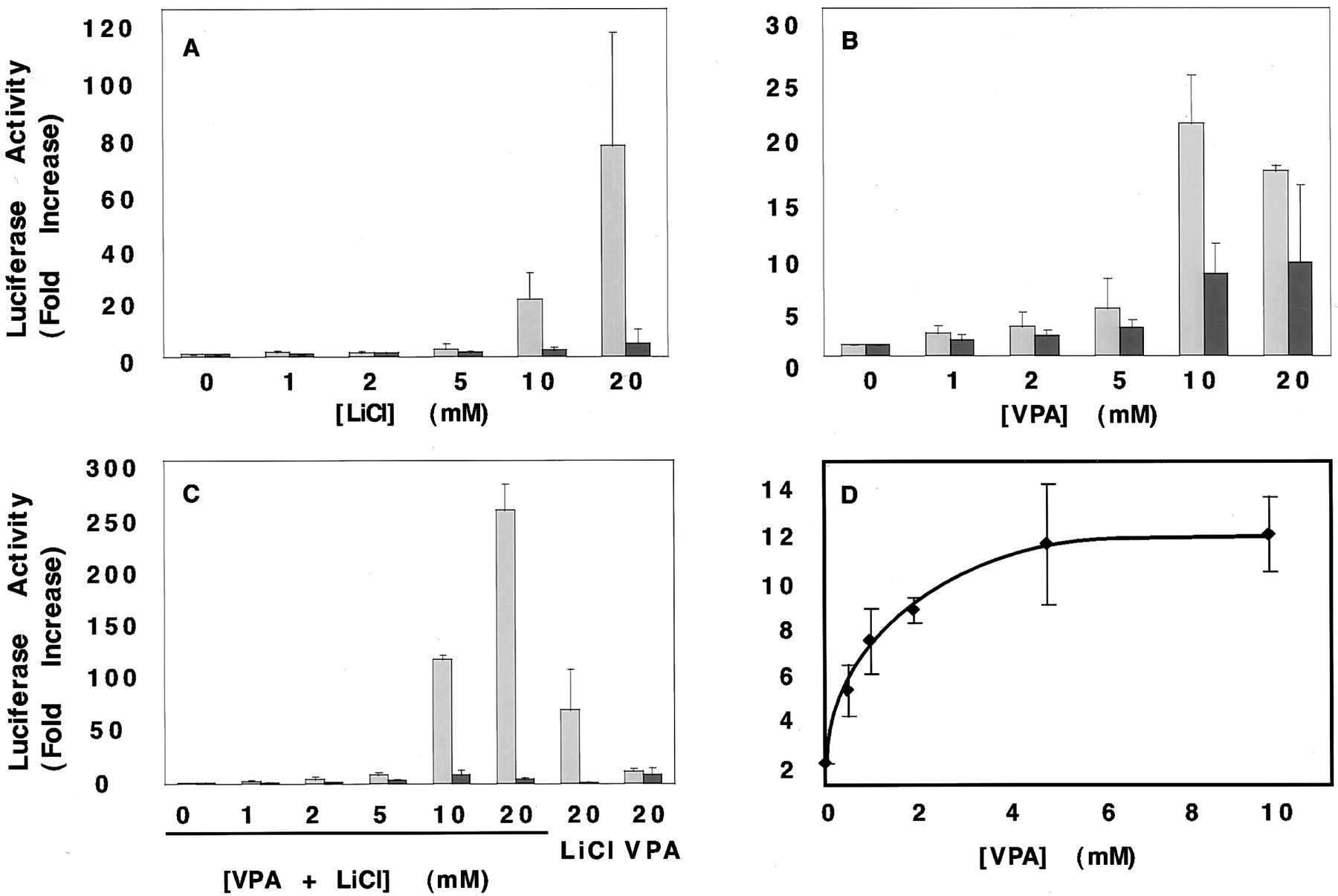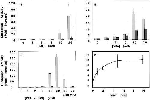 lithium. The activities of VPA and lithium alone (each at 20 mM) from panels A and B are shown for comparison. D, VPA causes a dose-dependent