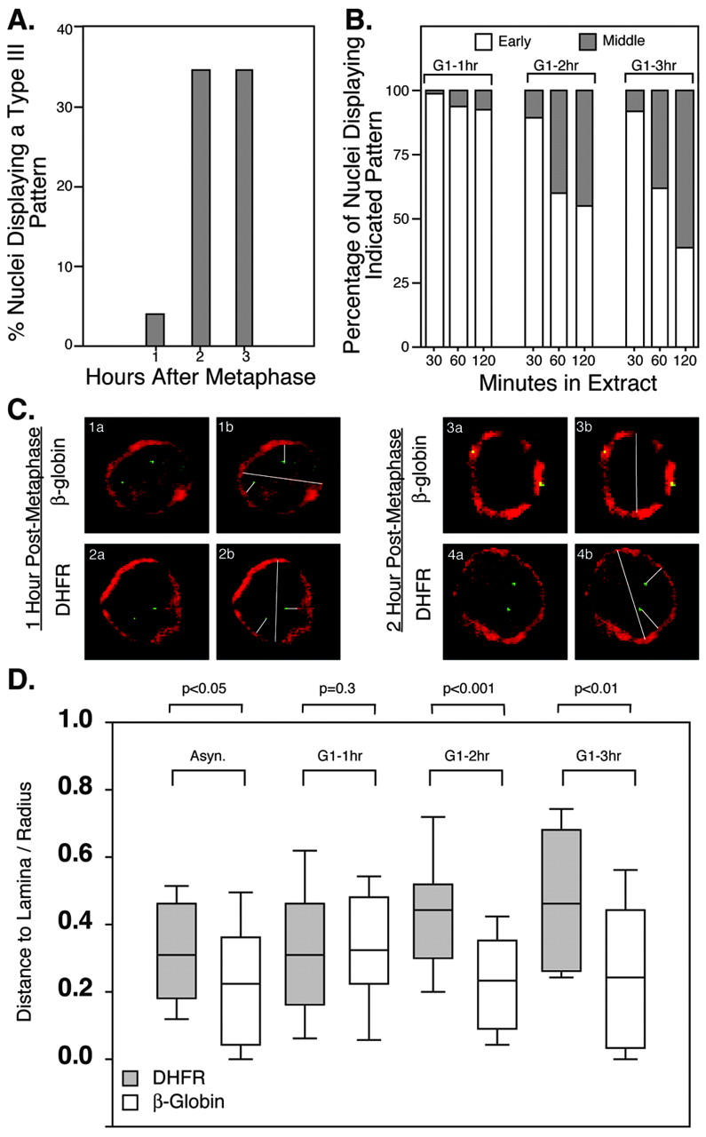 We have examined the dynamics of nuclear repositioning and the establishment of a replication timing program for the actively transcribed dihydrofolate reductase (DHFR) locus and the silent beta-globin gene locus in Chinese hamster ovary cells. The DHFR locus was internally localized and replicated early, whereas the beta-globin locus was localized adjacent to the nuclear periphery and replicated during the middle of S phase, coincident with replication of peripheral heterochromatin. Nuclei were prepared from cells synchronized at various times during early G1 phase and stimulated to enter S phase by introduction into Xenopus egg extracts, and the timing of DHFR and beta-globin replication was evaluated in vitro. With nuclei isolated 1 h after mitosis, neither locus was preferentially replicated before the other. However, with nuclei isolated 2 or 3 h after mitosis, there was a strong preference for replication of DHFR before beta-globin. Measurements of the distance of DHFR and beta-globin to the nuclear periphery revealed that the repositioning of the beta-globin locus adjacent to peripheral heterochromatin also took place between 1 and 2 h after mitosis. These results suggest that the CHO beta-globin locus acquires the replication timing program of peripheral heterochromatin upon association with the peripheral subnuclear compartment during early G1 phase.
