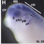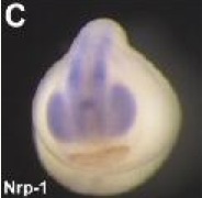 nrp1 (neuropilin 1) gene expression in Xenopus laevis embryo, assayed via in situ hybridization, NF stage 25, anterior view, dorsal up. |