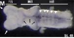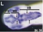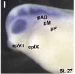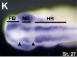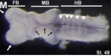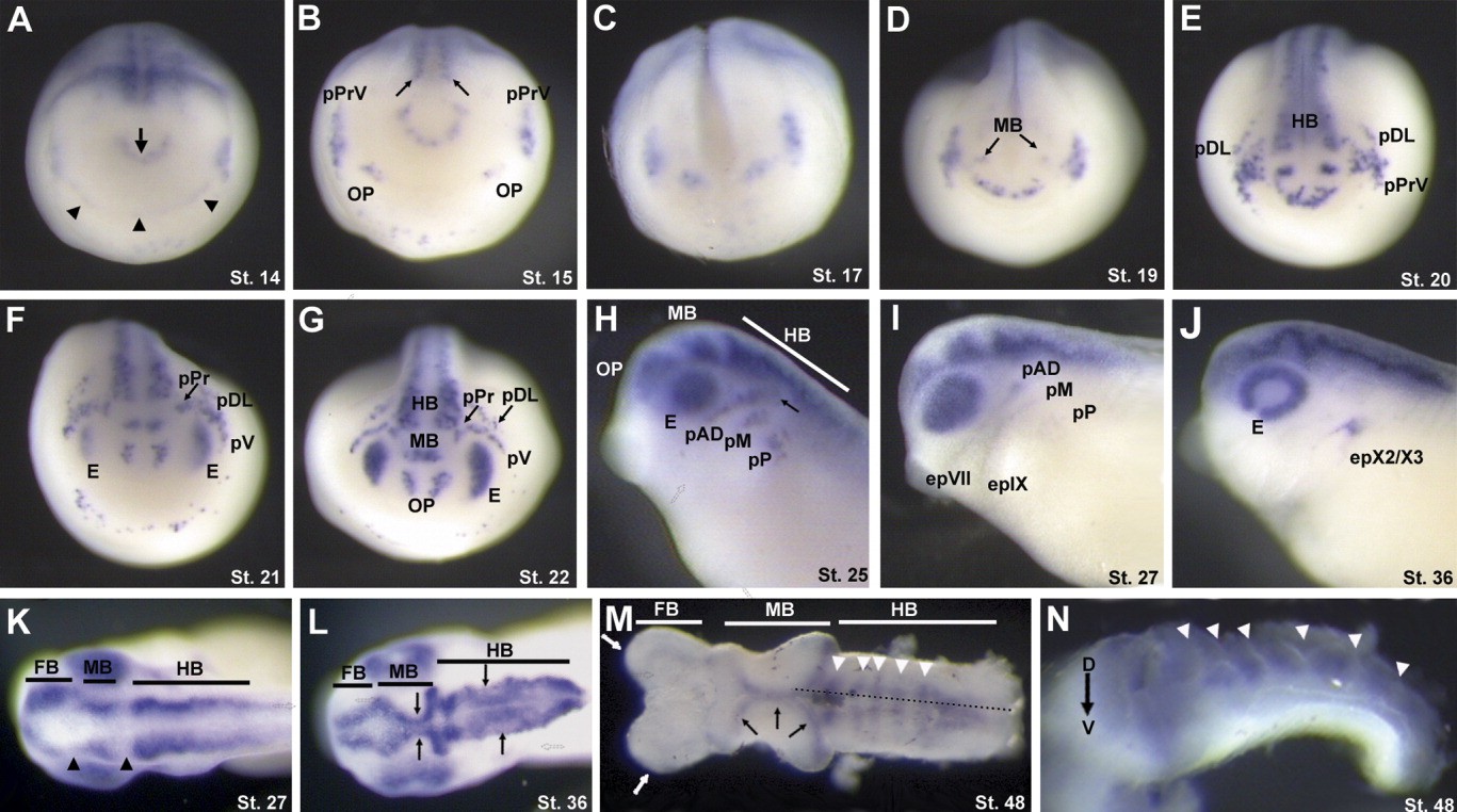 Figure 1. Evolution of X-Delta-2 anterior neural expression. A-G: Albino embryos from stage 14 (A) to 22 (G) shown from the anterior side with dorsal to the top. H-J: Lateral view of stage 25, 27, and 36 albino embryos; anterior to the left. The first appearance of X-Delta-2 expression in a certain region is marked in the figure, except in G and H, where all the regions are marked. Arrowheads in A indicate X-Delta-2 expression in the neural plate border, and the arrow indicates the basal plate border. Arrows in B indicate the expression in the neural tube. The arrow in H indicates the otic vesicle. Arrowheads in K indicate forebrain-midbrain and midbrain-hindbrain boundary. Arrows in L indicate the X-Delta-2 expression in the middle of the hindbrain. In M, white arrows indicate the expression in the forebrain, black arrows in the tectum of the midbrain, and the arrowheads the expression in the hindbrain. The dotted line in M represents the level of the cut shown in N. Arrowheads in N mark the rhombomere boundaries. Dorsal and ventral are shown by the arrow. E, eye; epVII, facial epibranchial placode; epIX, glossopharyngeal epibranchial placode; epX2/X3, fused second and third vagal epibranchial placodes; FB, forebrain; HB, hindbrain; MB, midbrain; OP, olfactory placode; pAD, anterior dorsal lateral line placode; pDL, dorsolateral placodal area; pM, middle lateral line placode; pP, posterior lateral line placode; pPr, profundal placode; pPrV, profundal-trigeminal placode area; pV, trigeminal placode. |