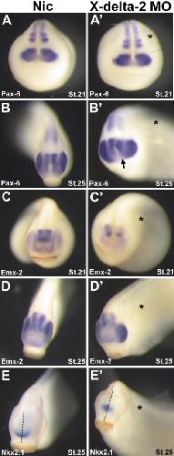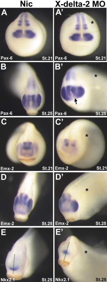 Figure 3. X-Delta-2 role in the establishment of the identity of the forebrain. A prime -E prime : Embryos injected with X-Delta-2 morpholino (MO) in the left-hand side were analyzed for the expression of the forebrain marker Pax-6 (A prime ,B prime ), the telencephalon marker Emx-2 (C prime ,D prime ), and the ventral forebrain marker Nkx2.1 (E prime ). Pax-6 and Emx-2 were analyzed at stage 21 (A,A prime and C,C prime , respectively), and at stage 25 (B,B prime and D,D prime , respectively), whereas Nkx2.1 was only analyzed at stage 25 (E,E prime ). Noninjected (Nic) controls are shown for each marker (A-E). All embryos are shown from the anterior side with dorsal to the top. The arrow in B prime indicates the loss of Pax-6 expression in the olfactory placode. Dotted lines in E and E prime indicate the midline. Asterisk indicates the injected side. |