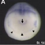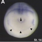 dlc (putative ortholog of delta-like protein C precursor (SwissPro) ) gene expression in Xenopus laevis embryo, assayed via in situ hybridization, NF stage 14, anterior view, dorsal up. |