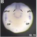 nrp1 (neuropilin 1) gene expression in Xenopus laevis embryo, assayed via in situ hybridization, NF stage 21, anterior view, dorsal up. |