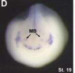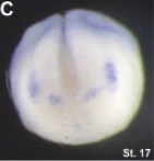 dlc (putative ortholog of delta-like protein C precursor (SwissPro)) gene expression in Xenopus laevis embryo, assayed via in situ hybridization, NF stage 19, anterior view, dorsal up. |