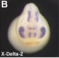 dlc (putative ortholog of delta-like protein C precursor (SwissPro)) gene expression in Xenopus laevis embryo, assayed via in situ hybridization, NF stage 22, anterior view, dorsal up. |