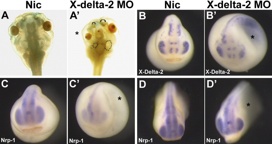 Figure 2. X-Delta-2 loss of function affects the central nervous system. A prime : X-Delta-2 morpholino (MO) was injected in the two left blastomeres at the four-cell stage, and the phenotype was analyzed in embryos at stage 48. B prime -D prime : The expression of X-Delta-2 at stage 21 (B prime ) and Nrp-1 at stage 21 (C prime ) and stage 25 (D prime ) were also analyzed. A-D: Noninjected (Nic) embryos are also shown. Embryos at stage 48 are shown from the dorsal side with anterior to the top (A), and embryos at stage 21 and stage 25 are shown from the anterior side with dorsal to the top (B-D). Brackets and dotted circles in A prime indicate the olfactory pits and the otic vesicle, respectively. The asterisk indicates the injected side. |