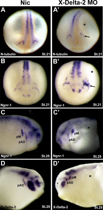 Figure 6. A-D prime : X-Delta-2 role in the neurogenic placodes. Noninjected (Nic) controls (A-D) and embryos injected on the left-hand side with X-Delta-2 morpholino (MO; A prime -D prime ) were analyzed for the expression of N-tubulin (A,A prime ) X-Ngnr-1 at stage 21 (B,B prime ) and stage 25 (C,C prime ), and for the expression of X-Delta-2 at stage 25 (D,D prime ). Embryos at stage 21 are shown from the anterior side with dorsal up, and the ones at stage 25 are shown from the lateral side with dorsal to the top, Nic with anterior to the right side, and injected embryos with anterior to the left side. Arrows in A prime and B prime indicate the N-tubulin and X-Ngnr-1 expression, respectively, in the profundal-trigeminal placodal area (pPrV). pAD, anterodorsal lateral line placode; pM, middle lateral line placode. Asterisk indicates the injected side. Note that the stage 25 Nic inC and D for X-Ngnr-1 and X-Delta-2 are the noninjected side of the same embryo shown in C prime and D prime , respectively. |
