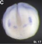dlc (putative ortholog of delta-like protein C precursor (SwissPro)) gene expression in Xenopus laevis embryo, assayed via in situ hybridization, NF stage 17, anterior view, dorsal up. |