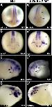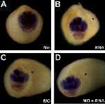 Figure 4. Rescue of Emx-2 expression in the telencephalon. A-D: Noninjected controls (A) and embryos injected on the left-hand side with X-Delta-2 RNA (B), X-Delta-2 morpholino (MO; C), or a combination of X-Delta-2 RNA and X-Delta-2 MO (D) were analyzed for the expression of Emx-2 at stage 21. Embryos are shown from the anterior side, with the dorsal side to the top. D: Overexpression of X-Delta-2 RNA was able to rescue the telencephalon expression of Emx-2 in X-Delta-2 MO-injected embryos. B: Emx-2 expression is slightly expanded when X-Delta-2 RNA is overexpressed. Asterisk indicates the injected side of the embryo. |