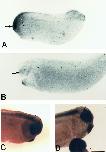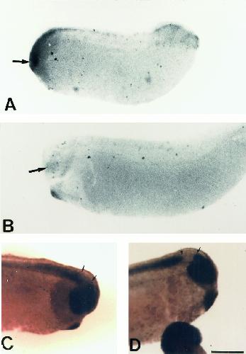 Figure 5. The effects of whole-embryo immersion in retinoic acid (RA) upon pax6 expression. A: Embryos were placed in RA (10-6 M) at stage 12 for 2 hr and allowed to develop to stage 28. There is very little positive pax-6 staining and optic vesicles did not evaginate. The staining was probably nonspecific staining within the open anteriorbrain cavity. B: Embryos placed in RA (10-6 M) at stage 14 for 2 hr exhibited little pax 6 expression, despite that these stage-28 embryos developed normal optic vesicles. C: Embryos placed in RA (10-6 M) at stage 16 for 2 hr exhibited pax 6 expression at stage 28, but this expression pattern differed from stage-28 untreated embryos (D) in that hindbrain expression of pax 6 is anteriorized to within the midbrain (double arrows) in RA-treated embryos compared with normals (D). Scale bar = 250 mu m in D (applies to A-D).