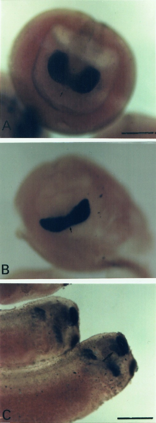 Figure 4. The effects of whole embryo immersion in retinoic aid upon Xbf1 expression. A: At stage 12, embryos were placed in retinoic acid (RA) (10-6 M) for 2 hr and allowed to develop to stage 28. There is very little positive Xbf1 staining. This Xbf1 staining is rather diffuse, and optic vesicles did not evaginate. Much of the staining was probably nonspecific staining due to the open anteriorbrain cavity. B: At stage 13, embryos were placed in RA (10-6 M) for 2 hr and allowed to develop to stage 28. There was a small amount of Xbf1 expression (arrow) in the most anterior aspect of the embryo (presumptive telencephalon). These embryos had optic vesicles, but the anterior neuropore did not fully close. C: Embryos incubated in RA (10-6 M) at stage 14 for 2 hr exhibited normal Xbf1-expression patterns after it was allowed to develop to stage 28. These embryos also had normal optic vesicles. Scale bar = 250 mu m in A (applies to A-C).