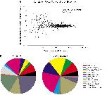 based on sequence analysis and are shown in the separate pie graphs. Color coding for the different groupings is shown on the right.