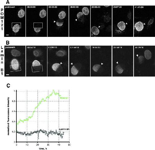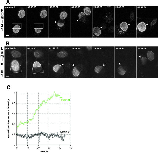 Figure 2. Turnover of NPCs and the lamina measured by FRAP. (A) FRAP of NRKPOM121-YFP3 cells. The boxed area was photobleached to background levels. Recovery was monitored immediately after the bleach and every 30 min by taking a stack of five confocal images after autofocussing. Representative maximum intensity projections are shown. Arrowheads mark the boundary between bleached and nonbleached regions. Time, hh:mm:ss. See Video 1 for the entire sequence. (B) FRAP experiment similar to A of NRK cells transiently expressing EGFP–lamin B1. Single confocal sections 0.5 μm above the coverslip surface were acquired every 15 min after autofocussing. Times, scale, and arrowheads as in A. See Video 2 for the entire sequence. (C) Plot shows fluorescence recovery of POM121 (green) and lamin B1 (black) in the bleached regions. Bleached and nonbleached half of the nuclei were tracked manually to measure mean intensities. Values were background subtracted and then normalized to total loss of fluorescence. Bars, 5 μm. Online supplemental material (Videos 1 and 2) is available at http://www.jcb.org/cgi/content/full/200101089/DC1.
