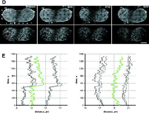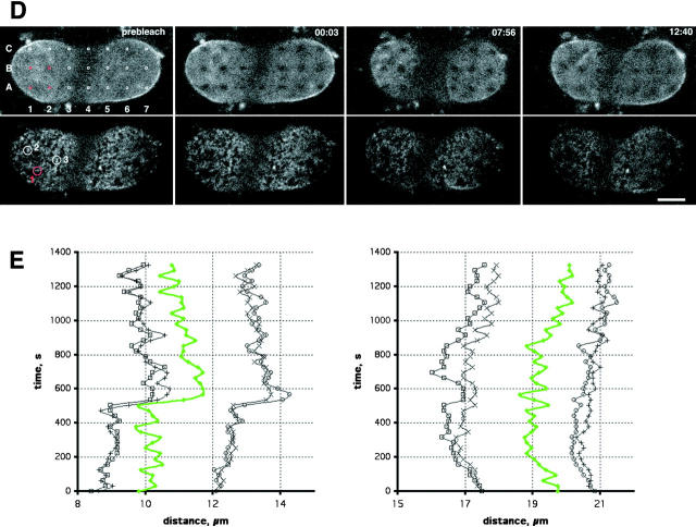 Figure 4. Tracking of NPC and lamina movement in interphase. (A) Time-lapse of a NRK cell expressing POM121-EGFP3 transiently. The lower nuclear surface was followed in a single confocal section every 2 s for a total of 30 min on a real-time confocal microscope. Sequence was averaged with a running window of five frames. Representative frames show numbered NPCs in a time window of ∼2 min used for tracking in B. Time, mm:ss. NPC movement is difficult to appreciate in still images; see Video 3 for the complete sequence. (B) Tracking of NPC movement. NPCs labeled #1–5 in A in a region of local NE movement are tracked together with two NPCs labeled C1 and C2 in A, which reside in an area of little movement and serve to illustrate global nuclear drift. Note the parallel and synchronous tracks of the NPCs. (C) Pattern FRAP of an NRK cell nucleus transiently expressing EGFP–Lamin B1. 33 1 × 0.5-μm regions were photobleached in the lower nuclear surface. Movement of landmarks was followed in single confocal sections every minute for 30 min (top row). Marks in the boxed area were used to track elastic deformations of the lamin lattice. Global cellular movement was corrected with two reference points. Relative position changes are shown in the bottom row as a network connecting the center of the bleach marks. Time, h:mm:ss; horizontal box length, 6 μm. (D) Pattern FRAP of a NRK nucleus transiently coexpressing POM121-YFP3 and ECFP–lamin B1. The outlined 21 0.9 × 0.6-μm regions were photobleached selectively in the lamina using a 413-nm Kr laser line. Movement of the lamina landmarks and the unbleached NPCs was then followed in single double-labeled confocal sections every 31 s for 30 min. Representative frames show distortion of nuclear shape by cell migration (note lamina folding at 07:56 and 12:40). Marks and NPCs used for tracking in E are red. Time, mm:ss. See Video 4 to better appreciate lamina elasticity. (E) Tracking of NPCs and lamina bleachmarks. Exemplary time-space tracks are shown for NPC #1 (green) and lamin grid marks A1–B2 (black) over 22 min in x, t and y, t plots. Global nuclear drift was normalized using to B5 and B7 marks. Note correlation between the x and y lamina and NPC movement. NPCs #2 and 3 and the surrounding marks behaved identically (not shown). Bars, 5 μm. Online supplemental material (Videos 3 and 4) is available at http://www.jcb.org/cgi/content/full/200101089/DC1.
